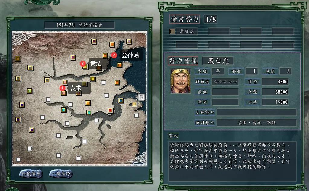 局势掌控者:这个版图刘、曹、孙三家都寄人篱下,代而替之则为公孙瓒、袁绍、袁术三家,失去了三国演义的三分天下的意义,因此这个剧本不好玩。