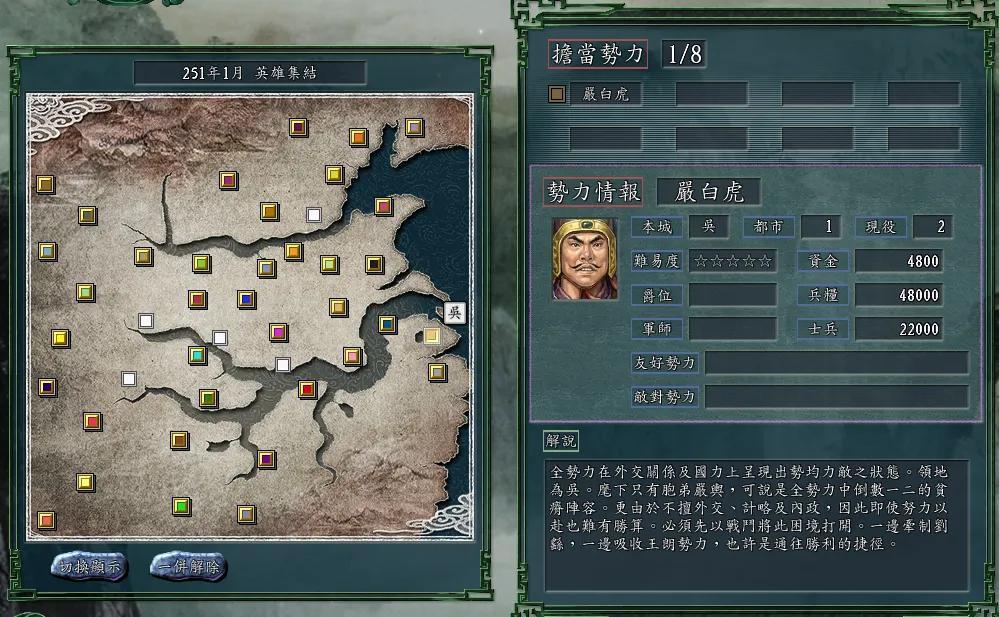 英雄集结:这个剧本英雄巨多,一座城池为一个势力,只要开局拿下任何一座城池,则其全部武将尽归己用,这个难度很简单,因此也不好玩。