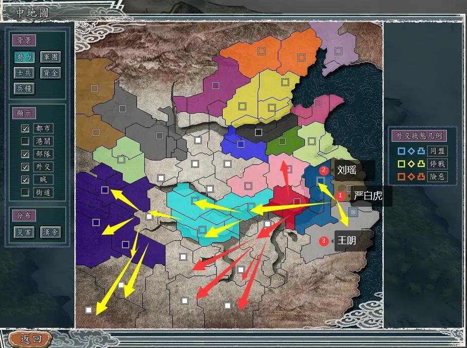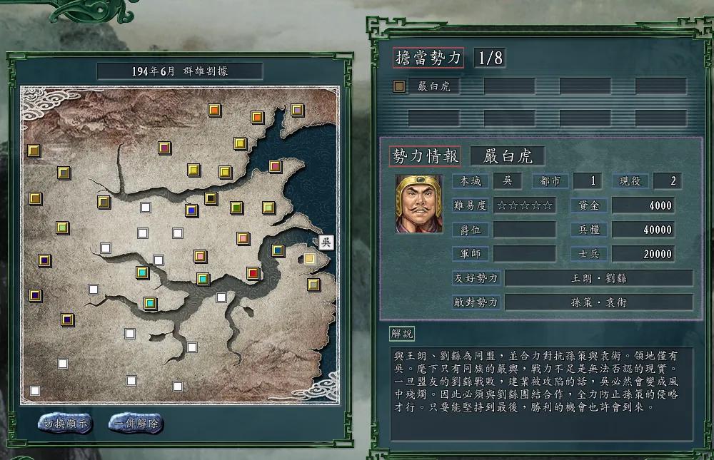 群雄割据:这个剧本就正常了,孙策用玉玺骗取袁术的兵将,驻守庐江,窥视着江东,刘瑶视其为眼中钉,前期为严白虎削弱孙策军。开局严白虎和王朗、刘瑶为盟军,共同保卫江东。